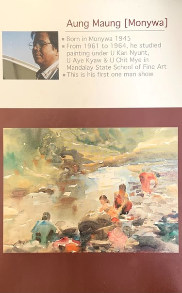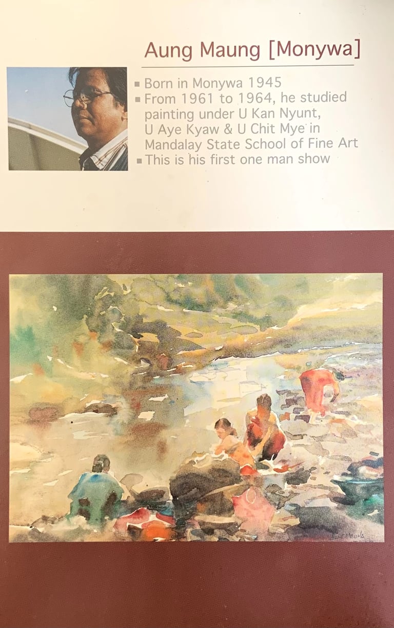U Aung Maung was born in the summer of 1945 in the peaceful town of Monywa, which at that time was at the end of World War 2. He was not born to a wealthy family, but had learnt to enjoy all he had in life and in the autumn of 1950, started school at the age of 7. He later studied painting under U Kan Myunt, U Aye Kyaw & U Chit Mye in the Mandalay State School of Fine Art. He would often cycle on his old Green bike to the places where he would paint, he would bring along his lunch and spend the quiet afternoons together with his canvas.